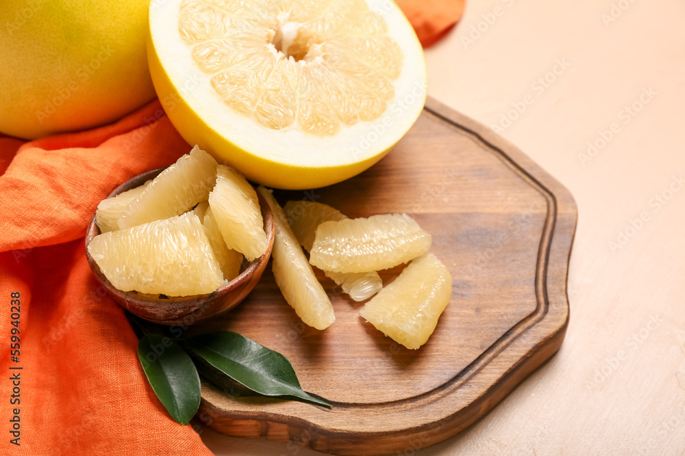 Wooden board with pomelo fruit on beige background, closeup