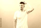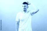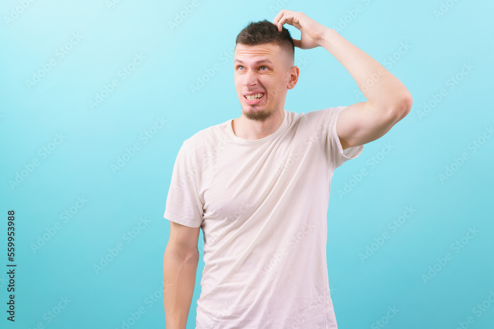 Young doubtful man thinking, scratching his head and looking up at the blue background. Casual. Casual Clothing. Only Men. Choose. Confused. Handsome. Model. Reaction. Relaxation. Scratch. Serious