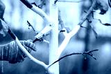 Whitewashing of fruit trees in autumn garden, gardener hand with brush painting apple tree with whitewash
