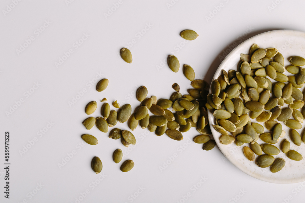 scattered pumpkin seeds top view on white background