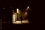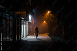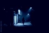 dark silhouette of a girl dressed in a long coat against the background of a night city with advertising showcases