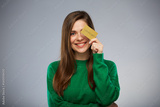 Young woman in green clothes holding credit card. Isolated advertising portrait.