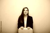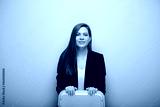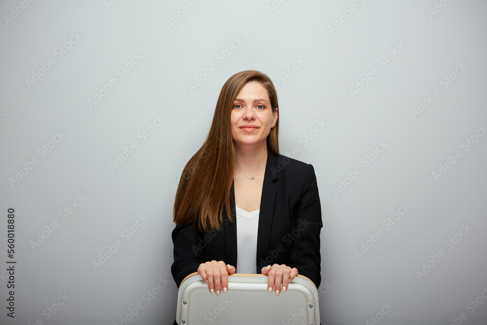 Smiling business woman in black suit sitting on chair isolated portrait with copy space.