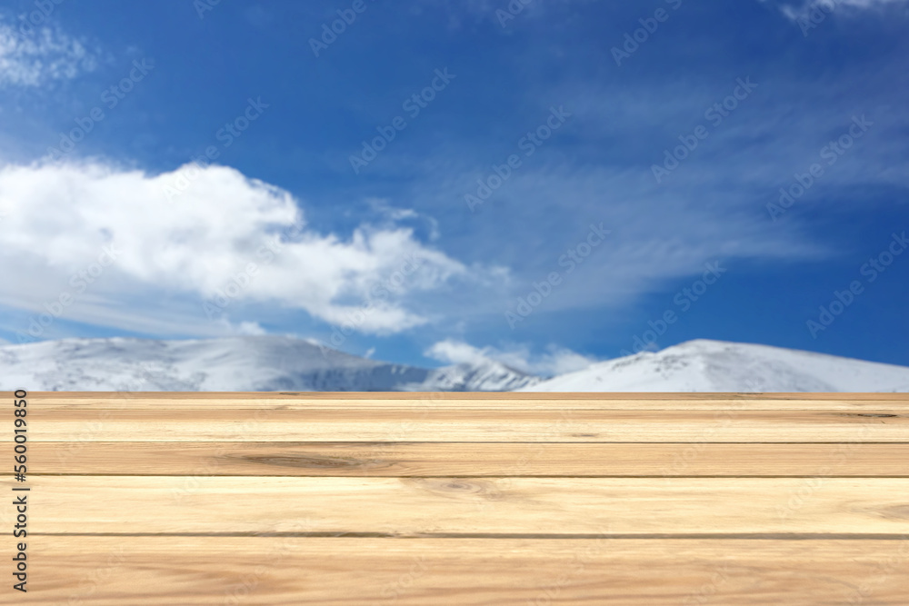 Wooden table made of boards with free space for your product or advertising text, snow-capped mountain peaks, blue sky and clouds, light tone.