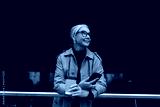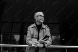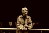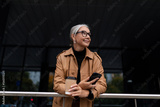 an elderly mature woman on the phone and a cup of coffee in her hands looks into the distance outside