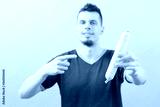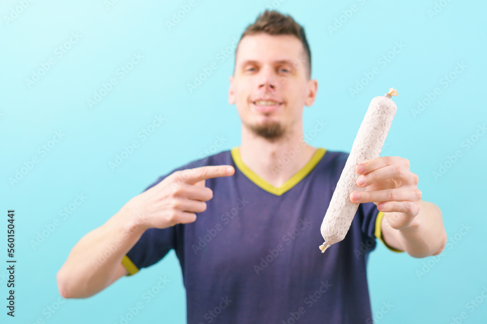 A man holds a Catalan white fuet sausage and points a finger at it on a blue background. Antipasto. Artisan. Cut. Dried. Iberian. Meal. Meat. Spiced. Ingredient. Pork. Spicy. Appetizer. Cuisine