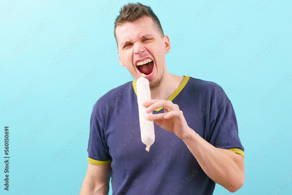 A man singing into a traditional white fuet sausage on a blue background. Spain. Thin. Buffet. Fat. French. Salami. Antipasto. Artisan. Cut. Dried. Iberian. Meal. Meat. Spiced. Ingredient