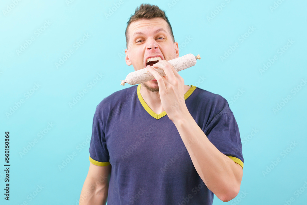 A crazy man with an open mouth eating a white fuet sausage on a blue background. Spain. Thin. Buffet. Fat. French. Salami. Antipasto. Artisan. Cut. Dried. Iberian. Meal. Meat. Spiced. Ingredient. Trip