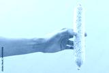 Man's hand holding a traditional white Spanish fuet thin dried sausage on a blue background. French. Salami. Antipasto. Artisan. Cut. Dried. Iberian. Italian. Meal. Meat. Spiced. Ingredient. Tripe