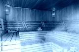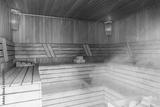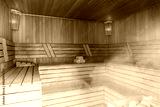 Interior of Finnish sauna, classic wooden sauna with hot steam. Russian bathroom. Relax in hot sauna with steam. Wooden interior baths, wooden benches and loungers accessories for sauna, spa complex