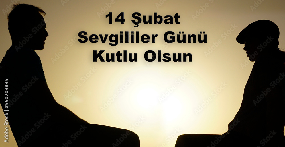 14 Şubat Sevgililer Günü Kutlu Olsun. Text translate: 14 February Happy Valentine's Day. Young couple sitting together on chair, looking at each other. Concept for website banner, social media post.