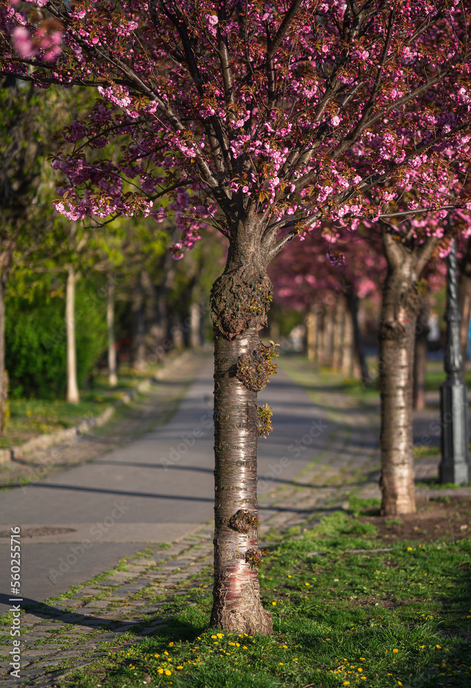 Blooming pink japanese cherry trees at the Arpad Toth Promenade, Budapest