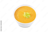 Celery carrot puree soup in a bowl on a white isolated background
