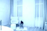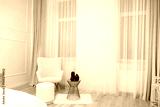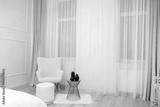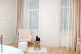 stylish and cozy luxury apartment with lounge chair, table and wooden floors. Details of master bedroom