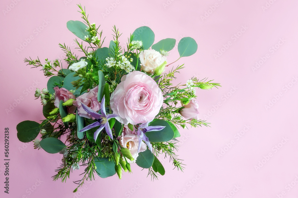 Flower bouquet from above against a pink background with copy space, feminine greeting card for Valentines day, Mothers day, Wedding or birthday, copy space, high angle view from above
