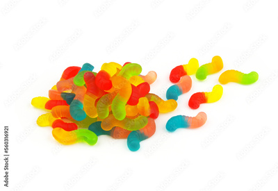 Multicolored gummy worms candies isolated on white background.