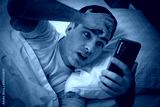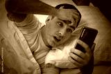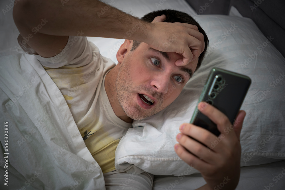 Stressed man with emotional expression and open mouth holding phone and looking at time of alarm clock on smartphone while lying on bed in bedroom. Surprise from the message on smarfton