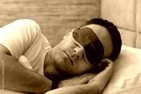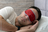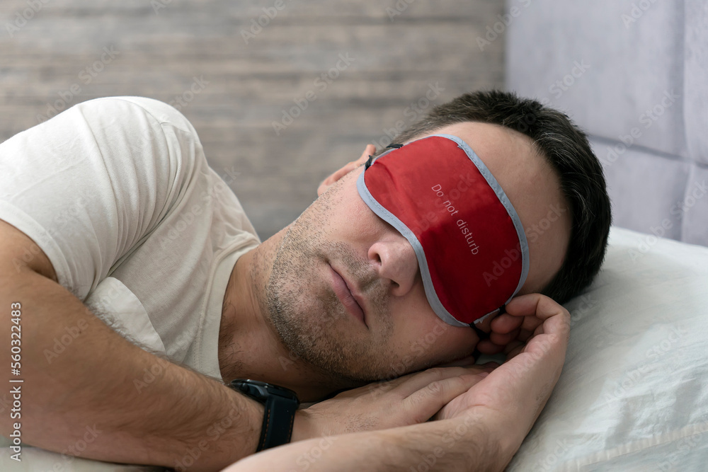 Calm caucasian man in sleep mask white t-shirt lying in bed sleeping slumber resting with closed eyes relaxing at home indoors bedroom. Good mood night morning bedtime concept. do not disturb