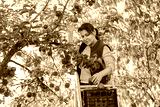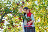 Harvesting apples, woman on ladder picking red ripe apples from tree