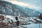 Young tourist man in warm clothes with camera shooting a photo on the background of winter city Lauterbrunnen in Switzerland Europe, Winter landscape, Concept of Travel and holiday