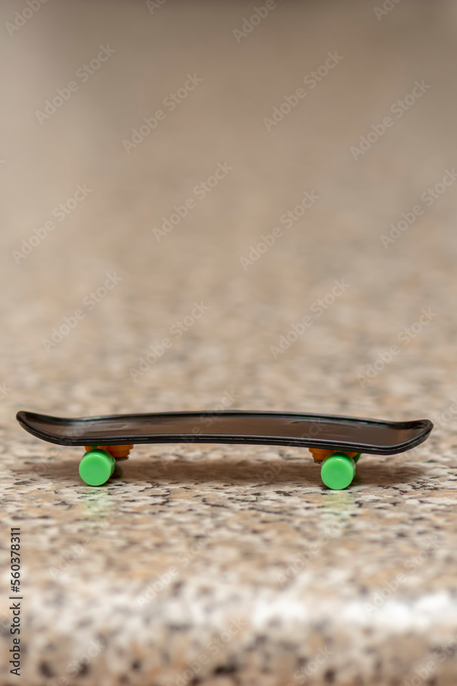 Fingerboard on a neutral background of marble surface, selective focus. A skateboard for finger skating and performing tricks along the way.