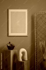 Interior design of living room with mock up poster frame, wooden stand, modern beige sculpture, vase with dried flowers, brown bowl, partition wall and personal accessories. Home decor. Template.