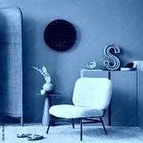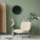 Creative living room interior composition with frotte armchair, folding screen, wooden commode and modern home accessories. Sage green wall. Template. Copy space. Real photo.
