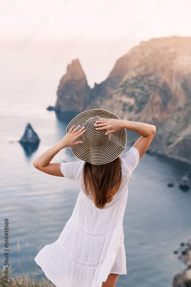 Young pretty female in white summer dress and holding straw hat watching beautiful seascape from high mountain. Lagoon with blue sea water and cliff coast in warm sunset light