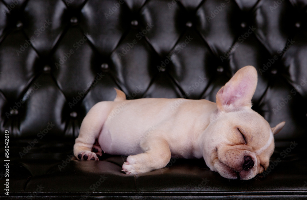 french bull dog asleeping on black sofa desk