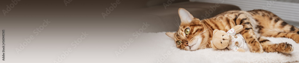 Bengal cat and soft toy sleep together. Pets. Animal care.