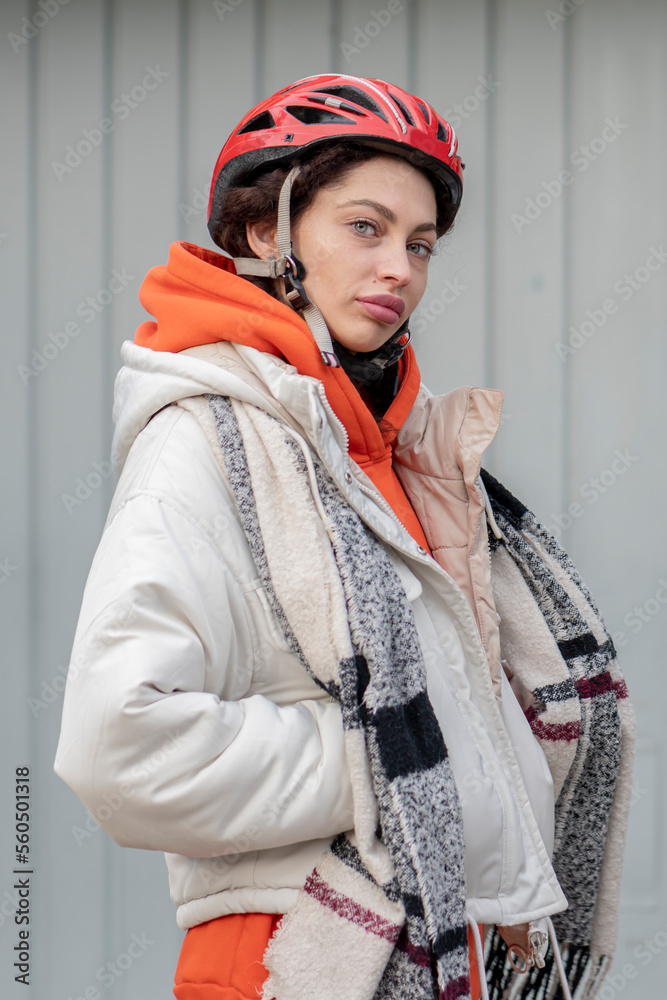 Portrait of a beautiful woman 25-30 years old with enlarged lips in a bicycle helmet on a neutral background.