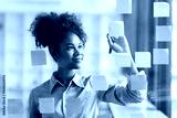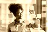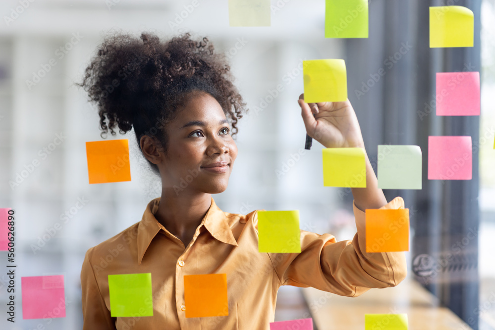 Young Serious african american Creative team use post it notes to share idea sticky note on glass wall. Asian business people design planning and Brainstorming thinking sticky History notes concept.