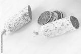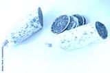 A top view of sliced white Spanish fuet sausage laying down on a white plastic cutting board on a blue background. Food. Spain. Buffet. Fat. Tripe. Pork. Spicy. Appetizer. Meat. Food