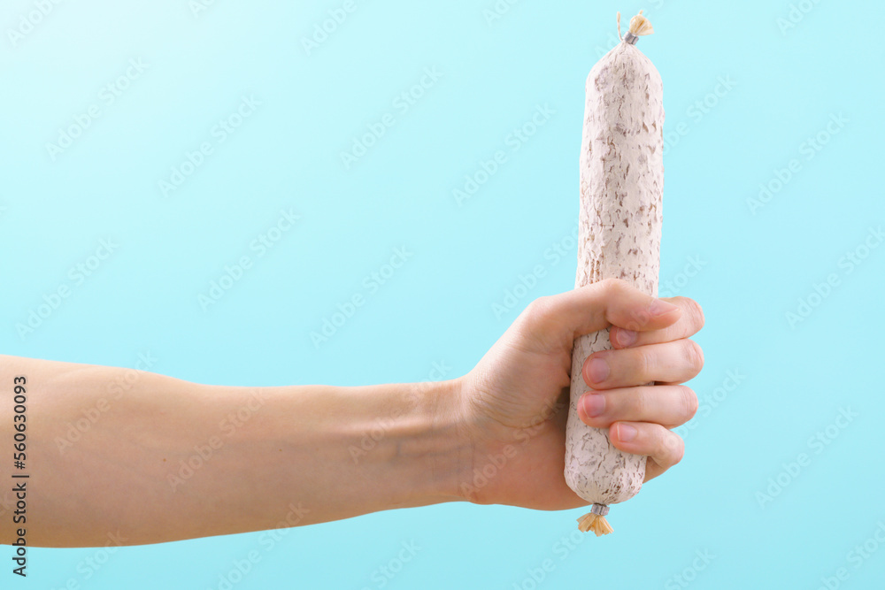 Man's hand holding a solid white Spanish fuet sausage on a blue background. Sausage. Spanish. Hand. Old. Background. Food. Spain. Mexican. Thin. Buffet. Fat. Tripe. Pork. Spicy. Appetizer