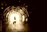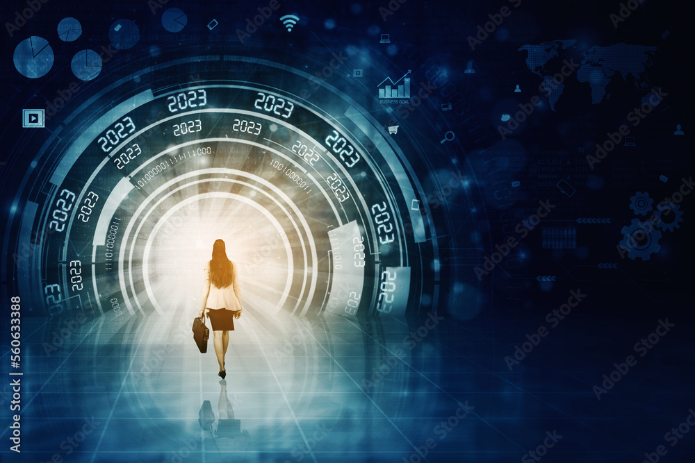 Woman walks toward futuristic tunnel background with 2023 text and interface graphic