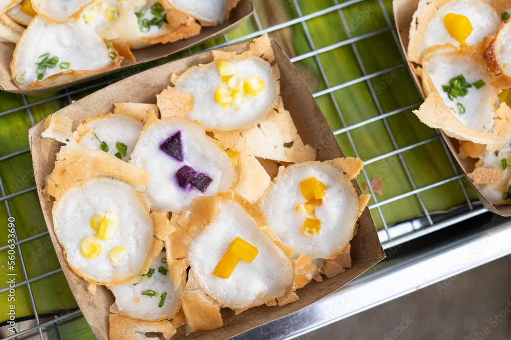Thai Dessert. Khanom Krok or Thai coconut milk pancake in paper plate. Sweet meal. Street food in Thailand.