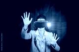 Asian businesswoman wearing vr goggles headset posing finger touching virtual screen