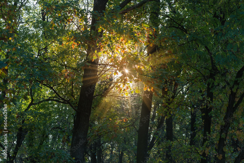 Fragment of the deciduous forest at autumn day backlit