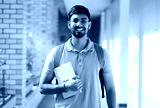 Face portrait, student and man in university ready for back to school learning, goals or targets. Scholarship, education and happy, confident and proud male from India holding tablet for studying.