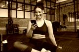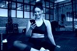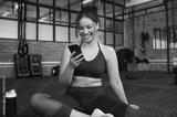 Happy woman, fitness and phone at gym for a workout, training and body wellness with a mobile app. Sports female with smartphone for progress, performance and communication for a healthy lifestyle