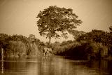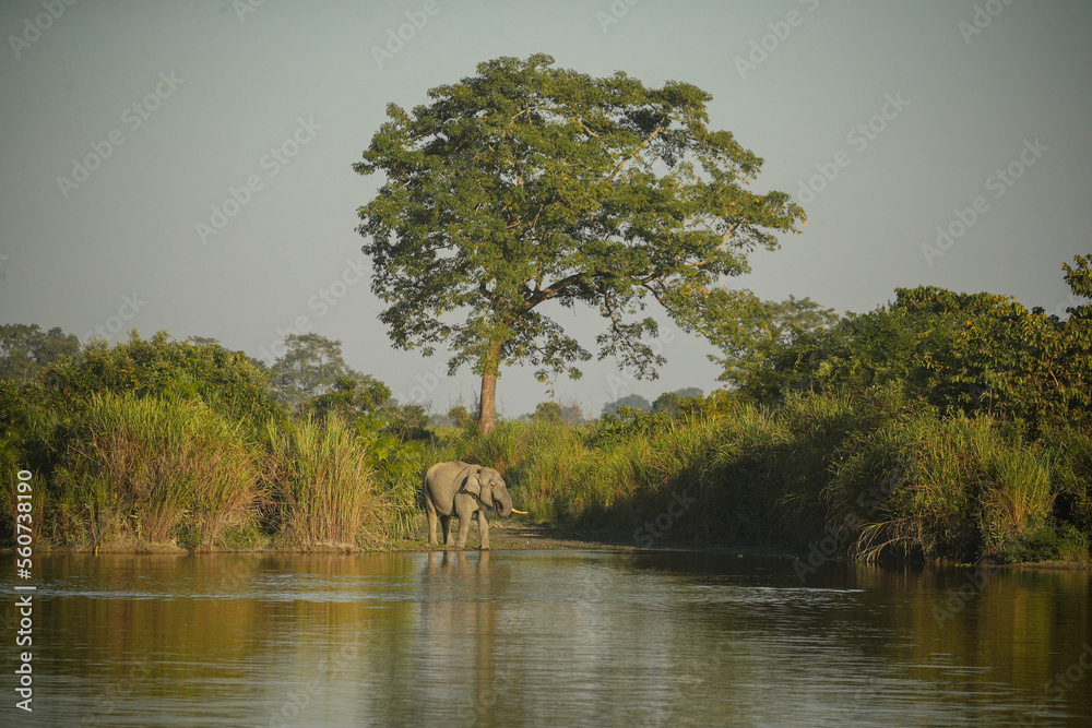 Asian elephant walk in the nature habitat. Elephants in the magical morning fog in Kaziranga national park. Indian wildlife. Elaphus maximus.