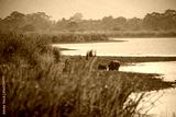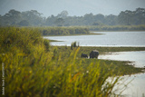Endangered indian rhinoceros in the nature habitat of Kaziranga national park in India. One horned rhino. Rhinoceros unicornis.