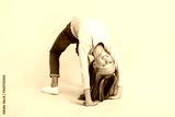 Full body portrait of cheerful nice schoolkid upside down make bridge isolated on pink color background