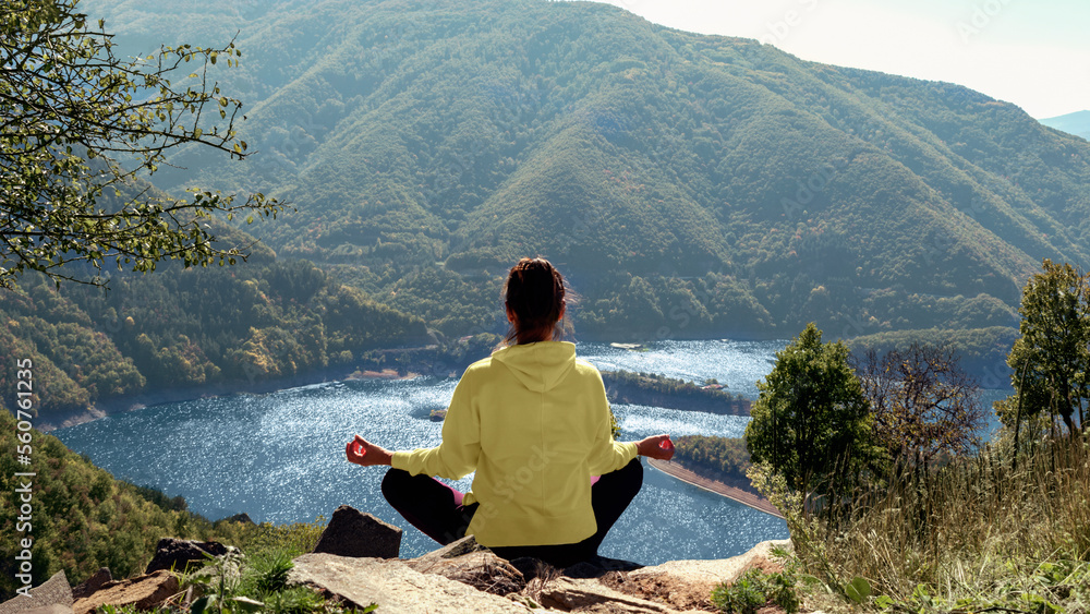 Young woman practicing yoga and meditating on nature. Back view girl relaxing on background of amazing landscape of mountain lake. Mindfulness, mental health, relaxation, vitality energy
