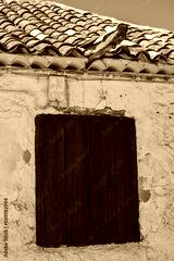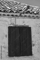 Spanish rural door in red color, Almedina, Ciudad Real, Spain