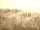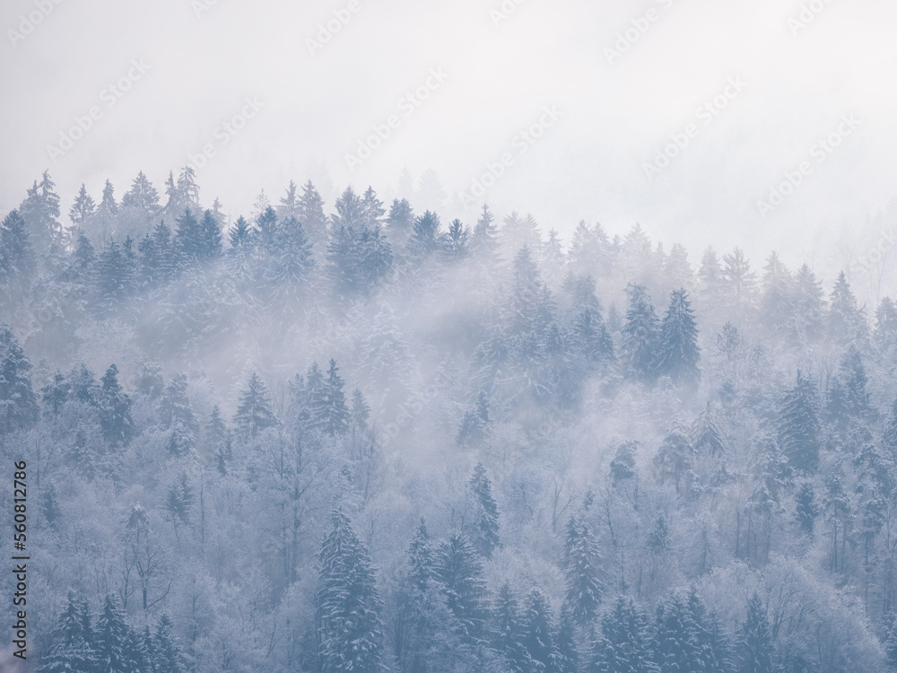 Snow-covered treetops revealing under misty remains of winter snowstorm clouds