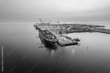 Cargo terminal loading shipping containers onto cargo ships, aerial footage, hyperlapse, Vancouver, BC, Canada, marine terminal, cargo crane.