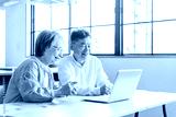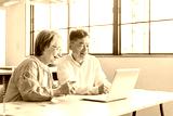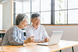 家のダイニングでパソコンを使う高齢者夫婦(爆笑・動画・映画・ビデオ通話)