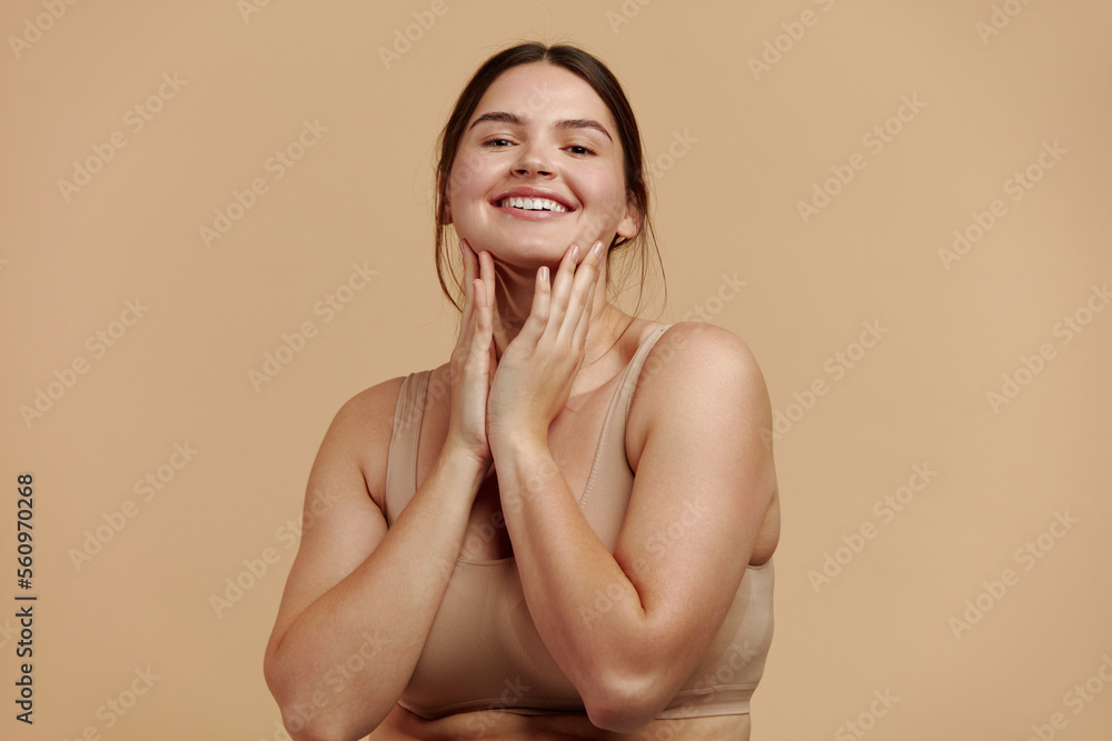 Smiling Woman Touching Face. Waist up Portrait of Attractive Woman Touching her Skin and Smiling While Applying Moisturiser. Woman Appearance and Skin Care Concept