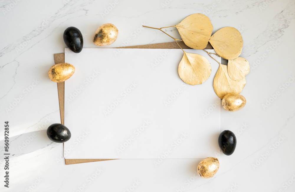 Mockup, Easter golden and black eggs with golden eucalyptus leaves.